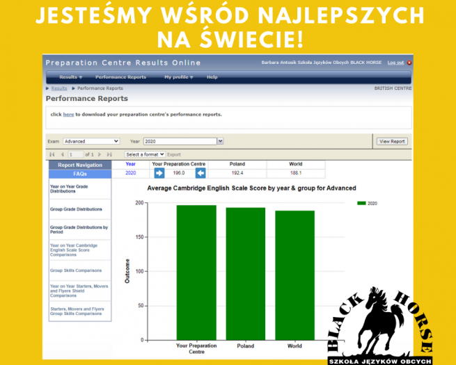 W sumie od 1998 roku międzynarodowe egzaminy z języka angielskiego Cambridge English w Black Horse zdawało 800 osób, spośród których egzamin zdało 790 osób – można więc powiedzieć, że 99% spośród nich. Brzmi niewiarygodnie? Może i tak, ale w naszej szkole każdy uczeń dostaje rzetelną rekomendację od swojego lektora, który określa, czy uczeń jest gotowy do egzaminu tak, by odnieść na nim sukces. A rekomendacja opiera się o wyniki testów egzaminacyjnych, które uczeń wcześniej przećwiczył, wynik egzaminu próbnego, ocenę odporności na stres egzaminacyjny, ocenę motywacji ucznia. Wszystko to sprawia, że przystępując do egzaminu w naszej szkole masz 99%-ową pewność, że odniesiesz sukces:)